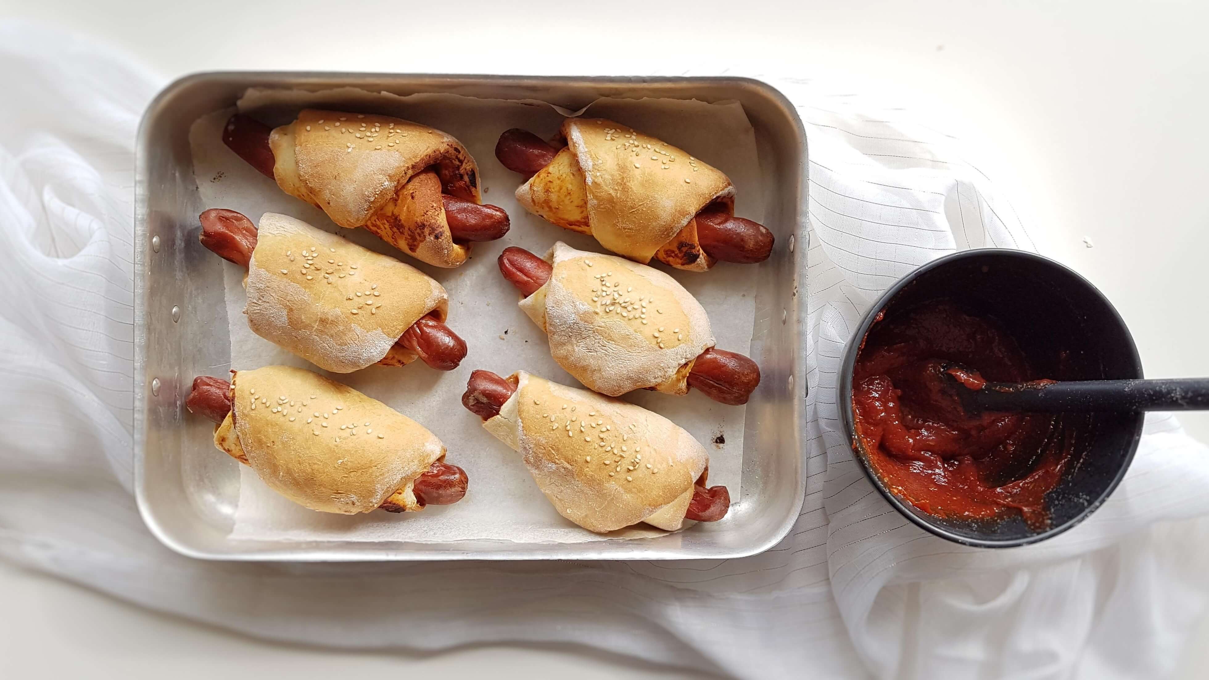 Sausages wrapped in an airy dough with BBQ sauce and sprinkled with sesames perfect as a snack on a trip or in a lunch. On Danish these tasty treats are called "pølsehorn" translated to sausage horn and are baked in the oven.