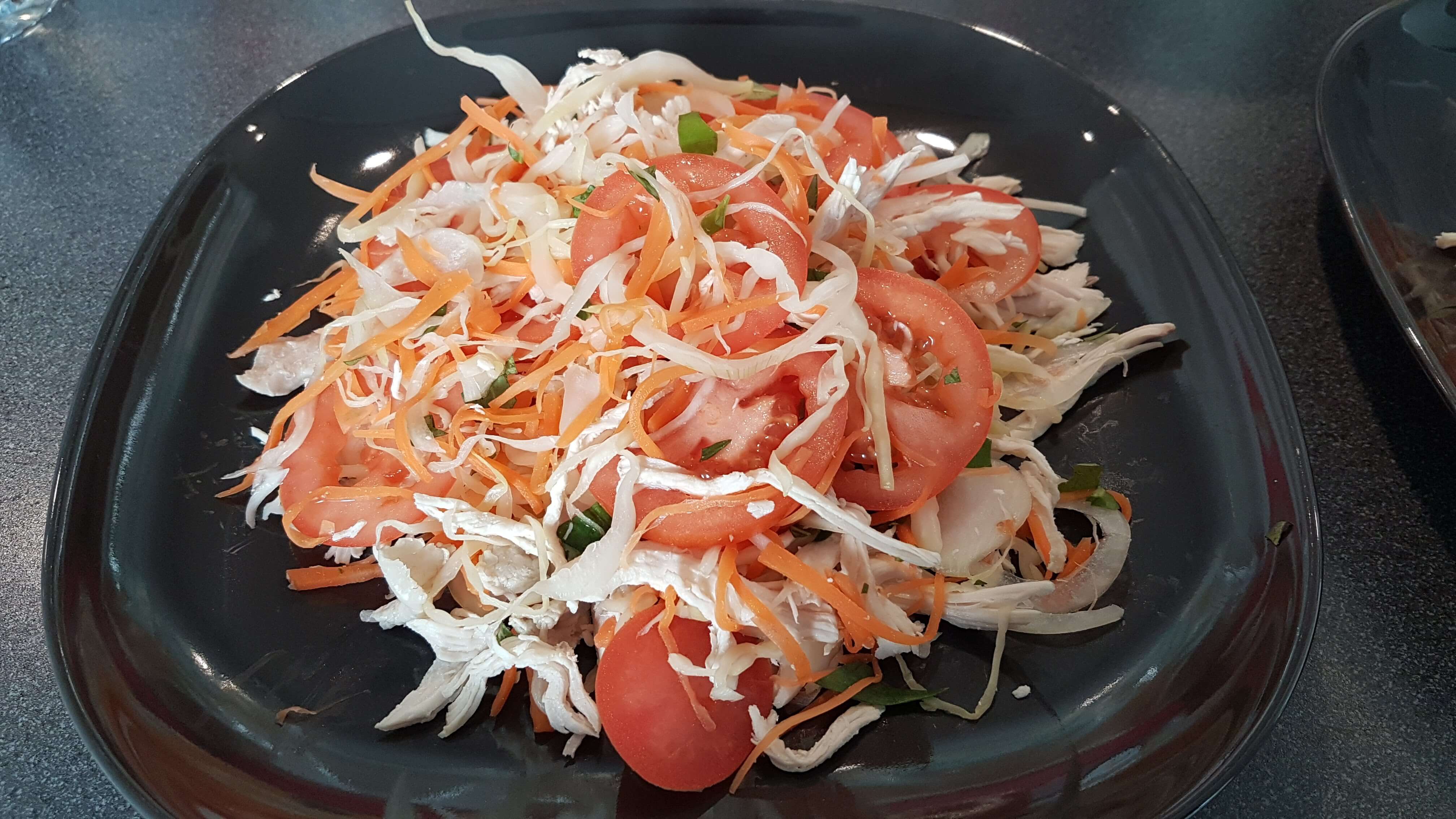 Fresh and light Vietnamese salad with boiled chicken pieces, white cabbage and carrots, served as an appetizer.