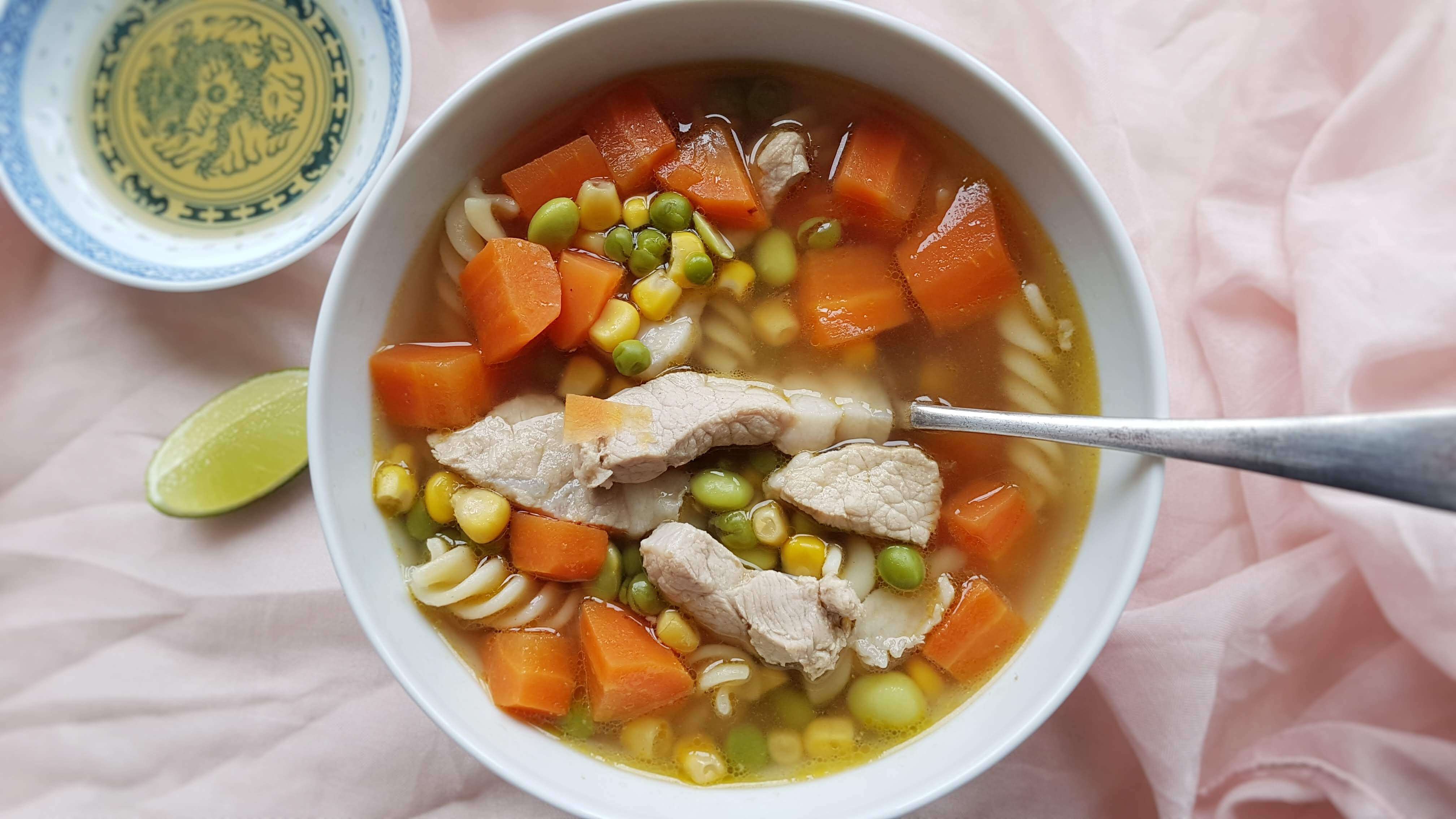 Simpel pasta suppe med grisekød og grøntsager i form af ærter, gulerødder og majs der ikke tager lang tid at lave.